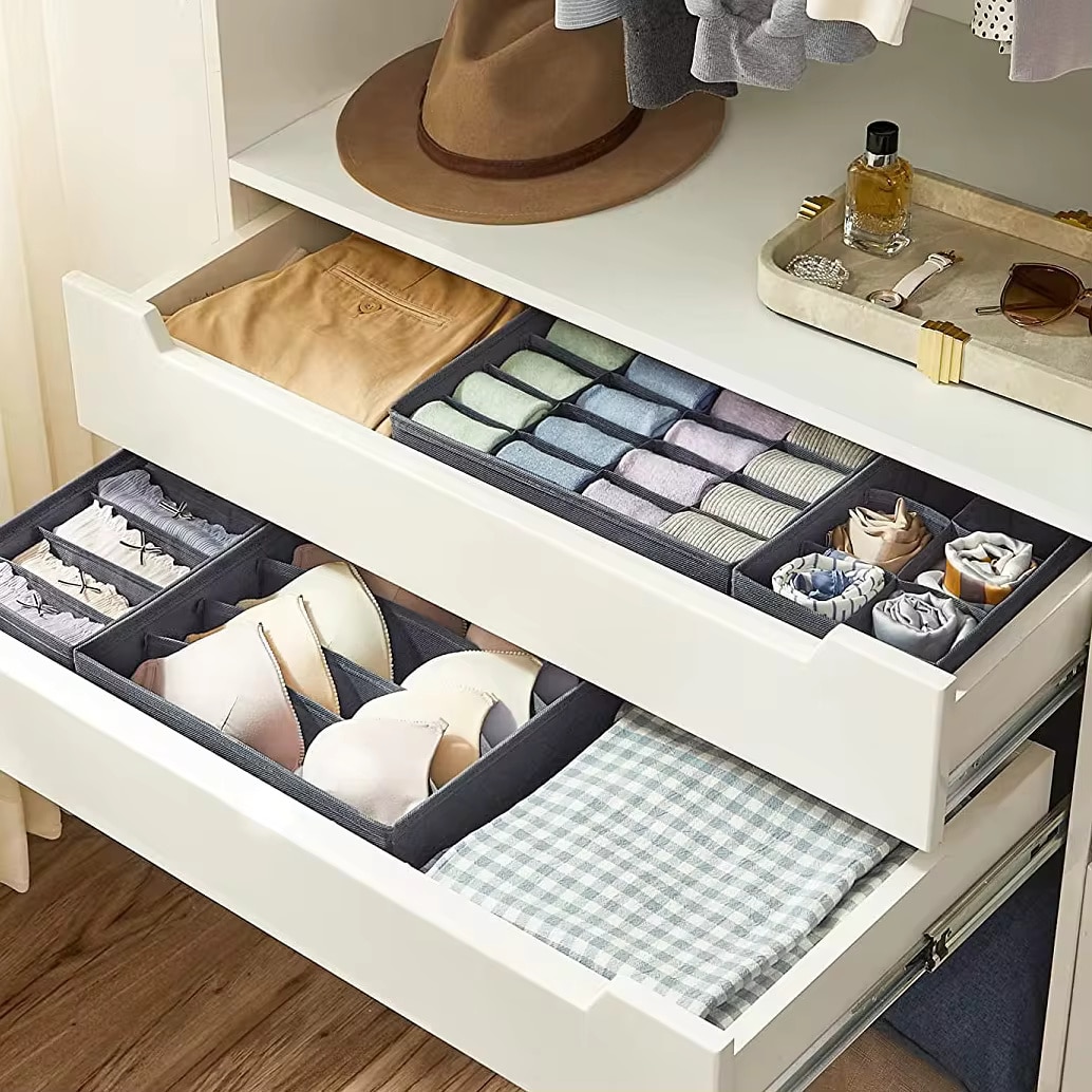 Acest set de 4 organizatoare de lenjerie intima va face ca pastrarea garderobei tale sa fie o joaca de copii. Pur si simplu puneti-l in sertar sau pe un raft si umpleti-l cu lucruri. Datorita posibilitatii suplimentare de stivuire, veti economisi nu numai timpul petrecut cautand, ci si spatiul pe care lucrurile l-ar ocupa altfel. Experimentati senzatia ca totul are locul sau si petreceti-va timpul cu lucruri mai importante decat cu aranjarea perpetua.